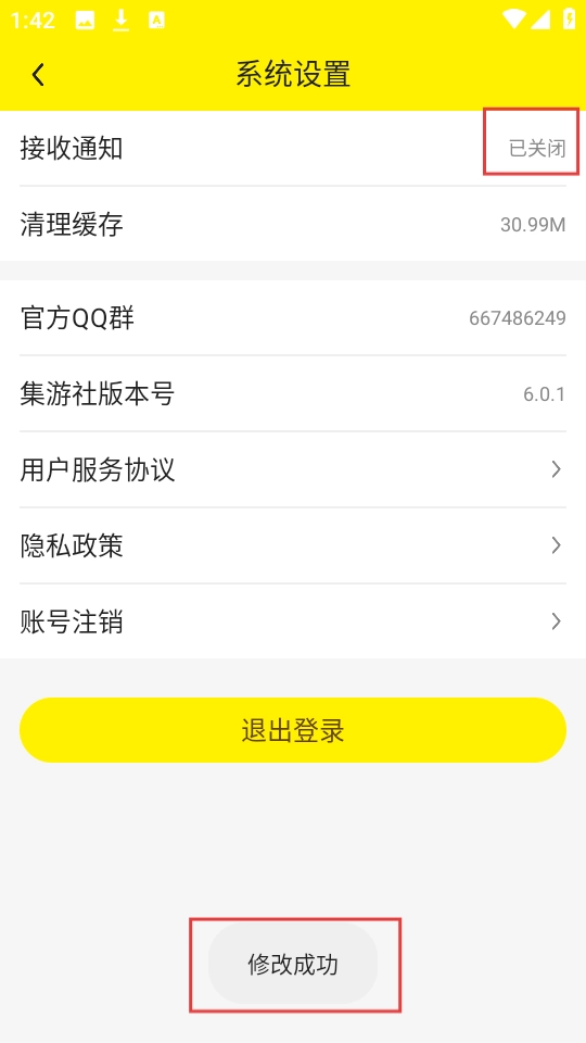 关闭接收通知后会显示【修改成功】的提示,之后就不会再收到该应用的通知了。
