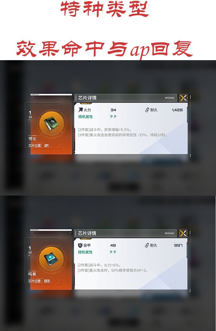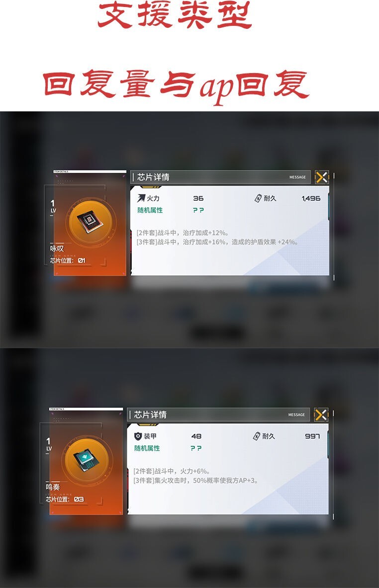 芯片的属性由2条主属性与4条随机属性组成。芯片获取时,会随机生成1到4条随机属性。每强化5级,芯片会随机提升一条已有随机属性,或是新增一条随机属性。(不同位置的芯片主属性存在差异:01位是火力+耐久,02位为装甲+火力,03位则是装甲+耐久;前期不必太在意随机属性,重点应放在套装效果上)