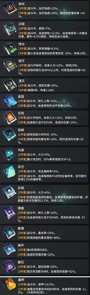 目前芯片套装总计16套,每套的效果与职业适配方向各有不同(具体套装效果可参考下图)。我将芯片划分为五大类:输出类、防御类、治疗类、增益减益类,以及回速类(作用为减少技能冷却时间、回复释放集火技能所需的AP能量与释放终极技能所需的EN能量)。我们会依据同步者的职业定位——突击型、特种型、重装型、支援型,给出对应的芯片推荐方案。不过实际搭配时,大家仍需结合同步者的具体技能特性进行灵活调整。未提及推荐的芯片类型,意味着当前版本下实用性相对较低。