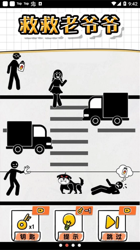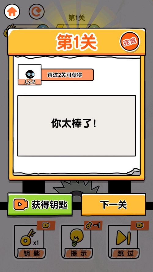 3、每个关卡底下分别有着钥匙、提示、跳过,各自有一个机会,帮助你快速通关哦!