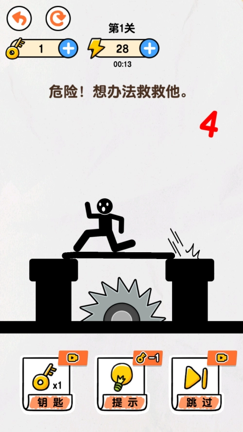 1、画线救救火柴人4版拥有很多有趣的关卡,玩法简单,只需绘制线条协助火柴人即可,来开始我们的解救火柴人闯关吧!