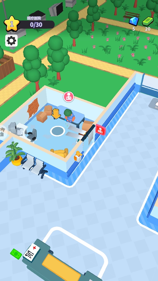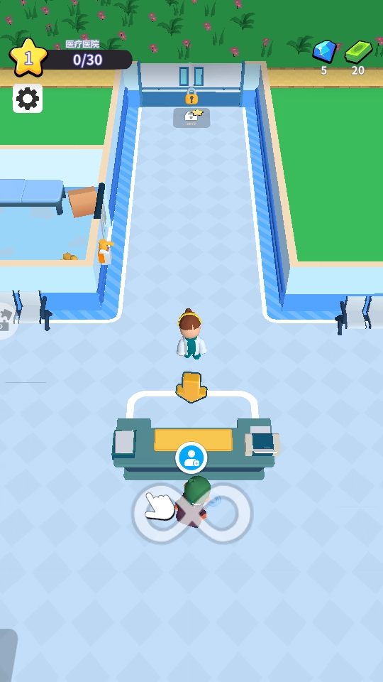 进入游戏后,按照箭头的指引来操作,点击柜台就能开启医院经营的第一步,记得留意上方显示的【医疗医院0/30】这个任务目标。