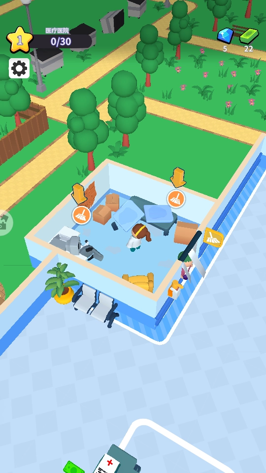 当房间内出现清理图标时,按照提示对物品进行清理,完成相关操作,以此逐步推进医院的建设与管理任务。