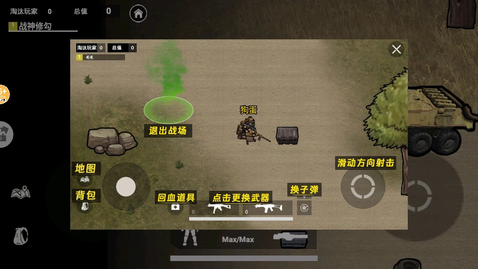 进入战场后,通过【滑动方向射击】来操作,借助【点击更换武器】切换武器,及时使用【回血道具】维持状态。