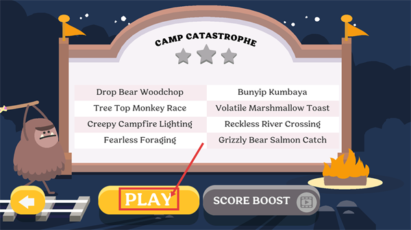 进入【CAMP-CATASTROPHE】关卡选择界面后,点击【PLAY】按钮,就能开启像【Drop-Bear-Woodchop】这类充满趣味的露营主题关卡挑战了。