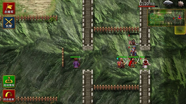 训练2的难度较高,流程也比较复杂:首先医生向左上方移动一格,给自己施加坚固状态,接着引出两个武道家,然后往右侧撤退——要精准计算敌方武道家5格的移动范围和4格的施法距离,这样既能拉出其中一个,还能在右侧村庄附近卡住另一个;练级用的武将则躲在后方施放策略。之后用同样的方法把第二个武道家也拉到相同位置,重复上述操作。解决掉这两个武道家后,队伍再向右上方的城池移动,引出南门的一名步兵;依旧是医生利用山地地形卡住位置,练级武将在后方放策略。由于步兵相对肉一些,而且城池里的敌方医生会出来加血,所以这里可以刷到30回合。