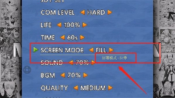 1、进入游戏设置,找到屏幕模式,将其设置为“拉伸”即可达成全屏的显示效果。