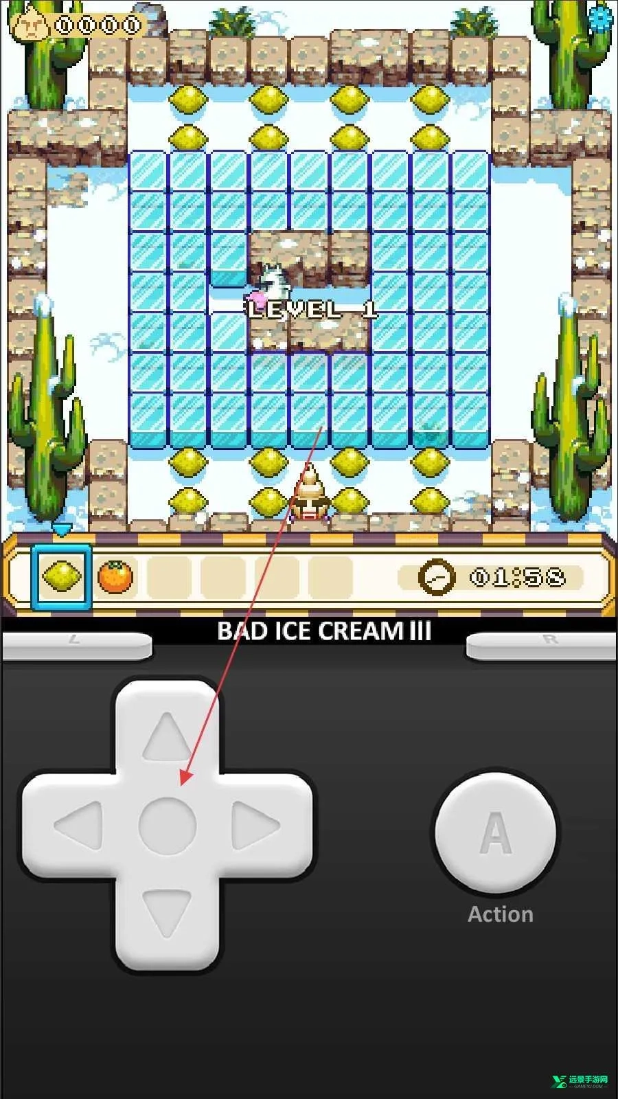 3、使用方向键控制角色移动,按下【A】键执行吐冰或互动动作,根据任务要求完成水果收集与敌人规避。