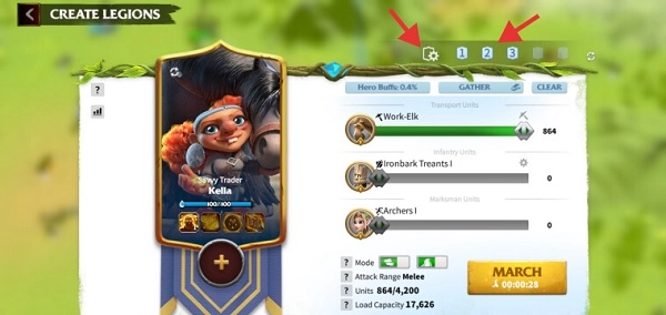 可以为您节省大量时间,因为您将能够准备多支具有不同部队和指挥官组合的军队,并保存它们以备将来使用。例如,你可以创建一个拥有强大PvP指挥官的军团,有或没有副手,以及最适合这种情况的最高级别单位。或者,一个专门为采集而生的军团,英雄拥有采集天赋和运输单位。