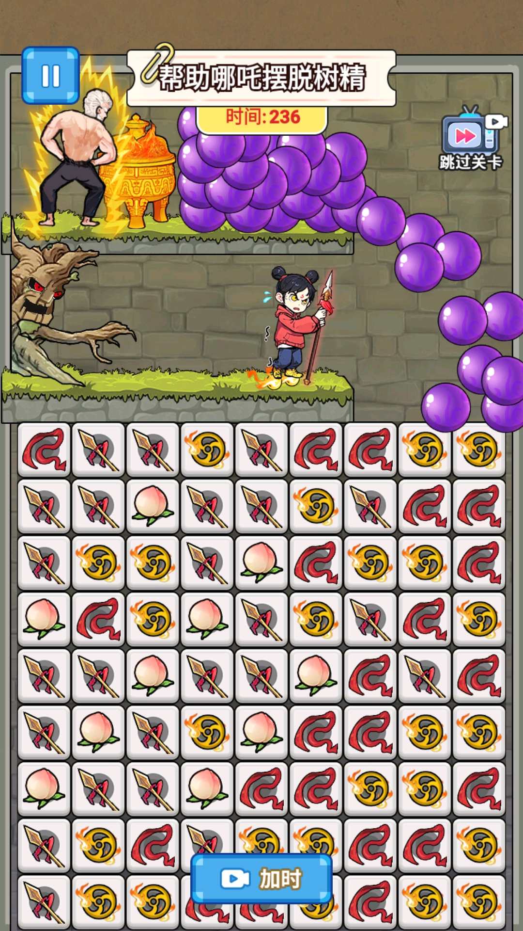 在规定时间内完成消除任务,助力哪吒躲开树精等敌人的追捕,顺利通关以解锁后续关卡。