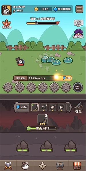 2、点击下方的装备可以对其进行升级,点击不同的矿石来获得经验,经验满后就可以提升装备等级。
