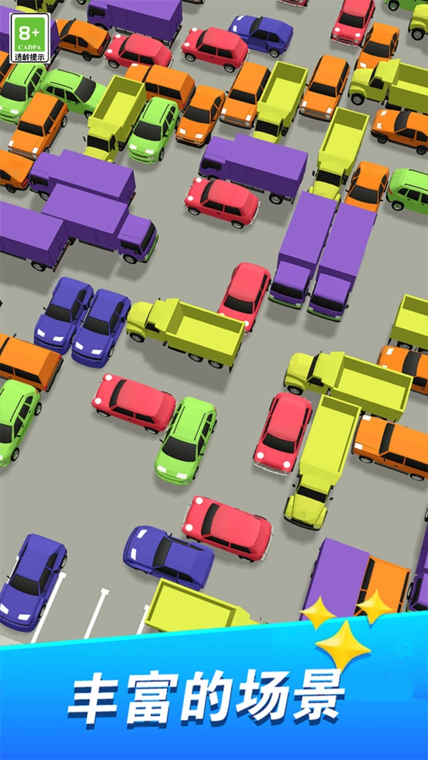 在停车场场景中,玩家需通过挪动车辆来疏通道路,目标是让所有汽车都驶出场景,简单的规则设计让新手也能轻松上手。