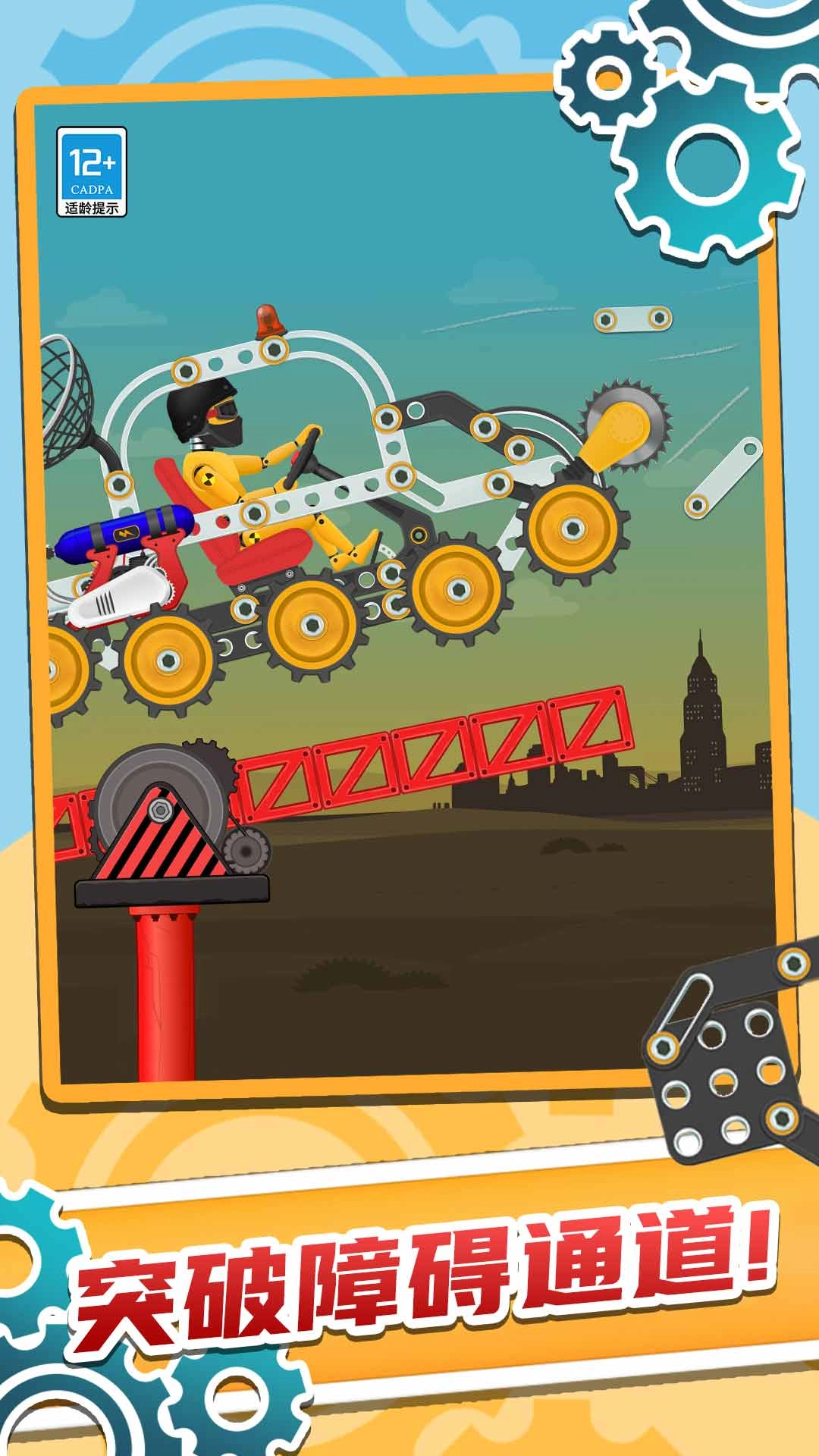 选择合适的赛道,驾驶组装完成的赛车飞驰,避开沿途的障碍并冲过坡道,借助锯片等零件技能破坏栏杆,顺利通过关卡。