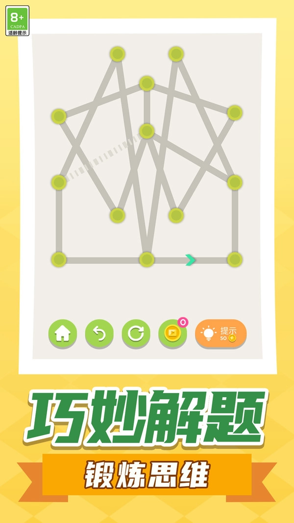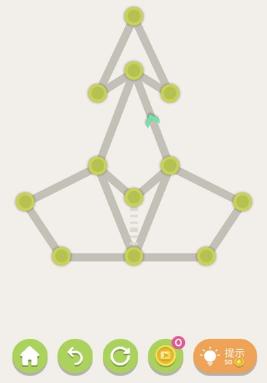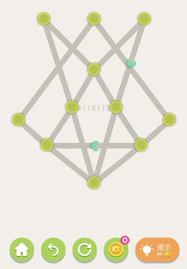 1、只有当线条从起点出发,一次性通过所有节点,不重复地画完所有空白线条,才算成功通关。