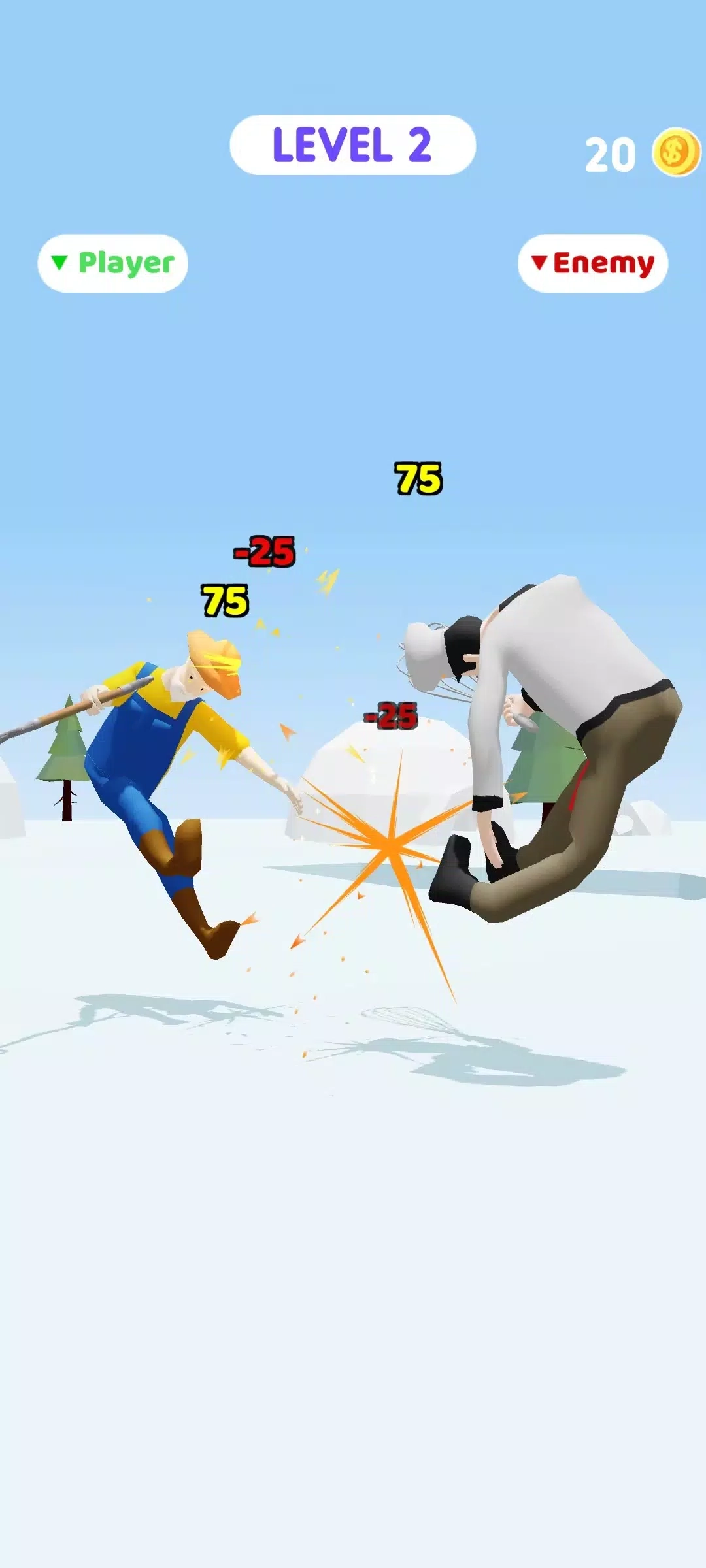 动作决斗是一款依托物理引擎打造的格斗闯关游戏。玩家通过滑动屏幕来操控角色的关节动作,以此攻击对手,击败对手即可成功通关。由于攻击对手的部位不同,造成的伤害也会有所差异,因此需要灵活调整攻击方式,才能赢得最终胜利。在物理引擎的作用下,角色的行动和攻击会更难控制,玩家需要多加练习才能熟练掌握技巧!