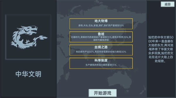 2、查看这个文明的效益情况,然后点击开始游戏;