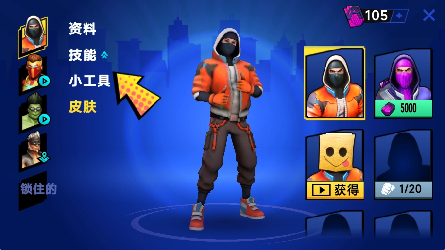 进入英雄界面,选择角色后点击小工具,查看并配置辅助道具,为战斗做好准备。