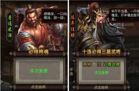 1、酒馆游戏前期除了主线收复任务送的基础武将之外,武将最直接的来源就是酒馆了,通过任务获得的米酒,5瓶米酒可以抽一次武将,有几率得武将,不过基本都是将魂,十连抽的话是比得三星武将的。VIP玩家每天前三次半价抽十连,在游戏前期可以每天抽三次,抽到武将很值。