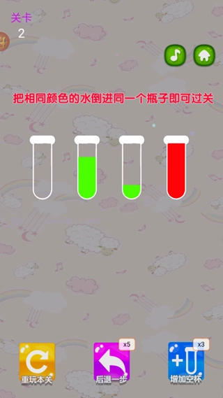 第二关的难度会稍微提升一些,但也只是一点点差别,主要是增加了一个瓶子。