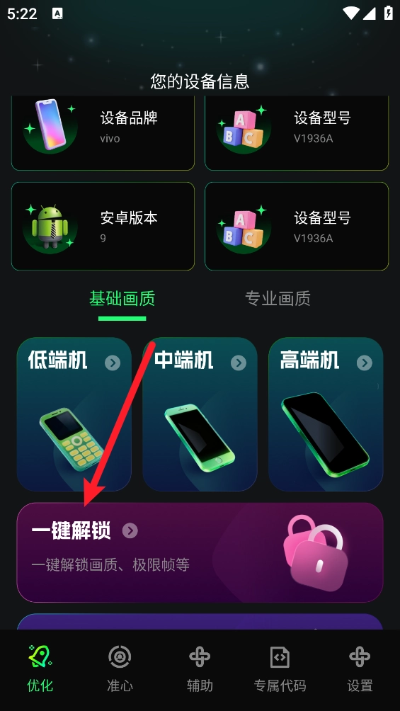 2、进入主页后可以进行查看设备信息,点击"一键解锁"。