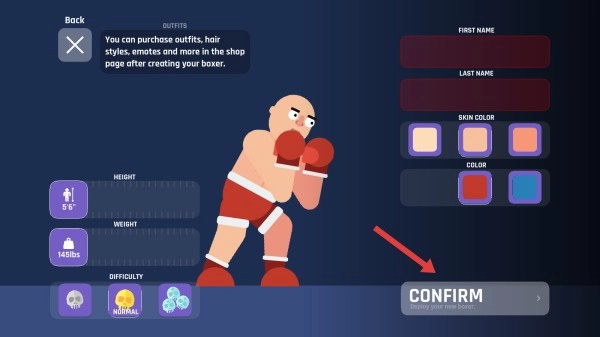 在拳击手创建页面,完成姓名、肤色等各项属性的设置后,点击【CONFIRM】按钮即可确认创建。