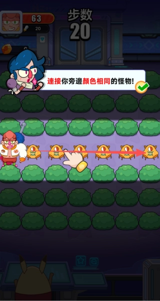 游戏的核心玩法是通过点击与滑动操作,把三个或三个以上颜色相同的怪物连成一条直线,以此来实现消除效果。