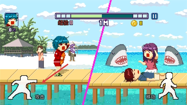 这是一款以热带海岛度假为背景,采用像素风格制作的横版卷轴动作闯关类休闲手机游戏。