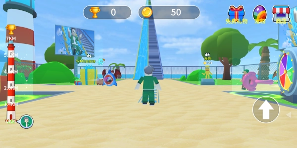 《欢乐跑跑大冒险》是一款趣味十足的动作跑酷游戏。玩家需要不断朝着楼梯高处攀登,当体力耗尽时,便可顺着楼梯旁的水流滑滑梯顺流而下。系统会根据玩家攀登的高度发放不同数量的金币奖励,之后玩家能用这些金币购买道具,助力角色攀登到更高的楼梯位置,完成更长距离的滑梯挑战。