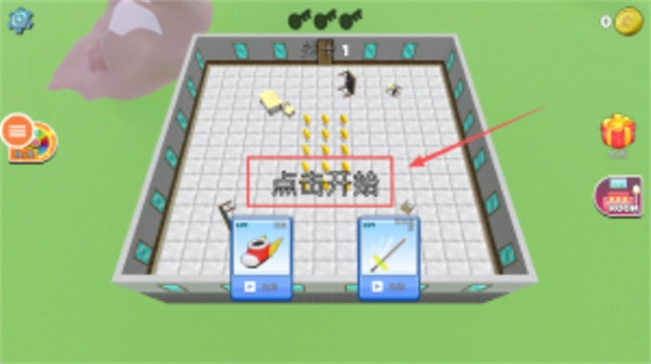 在浅灰色网格搭建的平台上,轻点红色方框里的开始按钮,留意观察黄色虚线构成的轨迹,以及周边小屋、企鹅这类场景元素的排布方式。