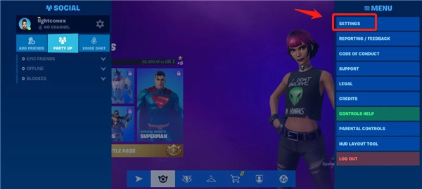 首先,打开正版的堡垒之夜,找到【SETTINGS】设置选项。