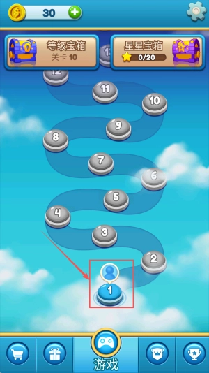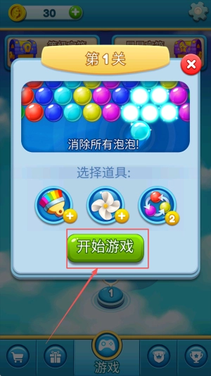 开始消除:进入关卡界面后,先确认本次需要达成的目标分数(例如30分或40分),接着点击“游戏”按钮,即可开启你的泡泡消除冒险。