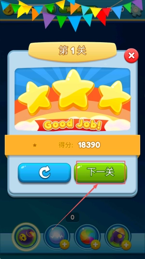 继续挑战:当屏幕上显示“太棒了!得分:18390”的提示时,点击“进入下一关”按钮,准备面对更具难度的关卡。