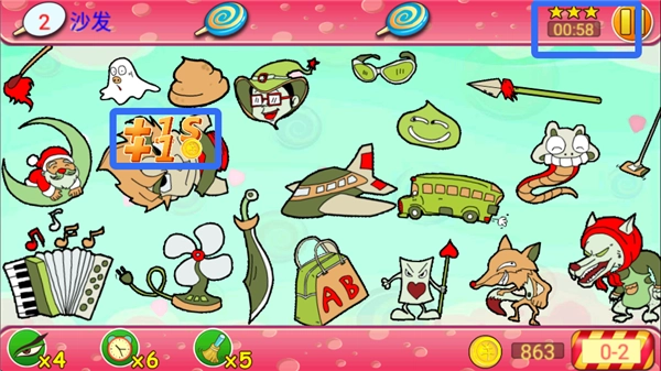 2、每一关都设有倒计时,每成功找到一件物品就能获得时间奖励和金币,玩家需要在倒计时结束前把所有物品都找齐才行。