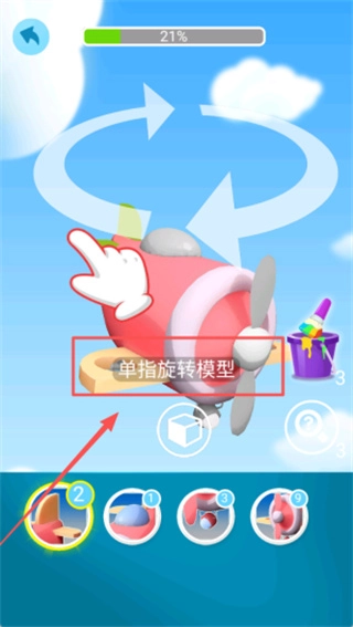 给飞机涂色时,用一根手指按住屏幕上的飞机模型并转动,就能调整角度,保证飞机的每个部位都能被涂到。