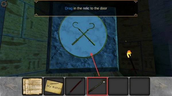 3、遇到石门时,按照提示,将对应道具拖到门上图案位置,触发机关打开通道。