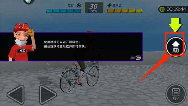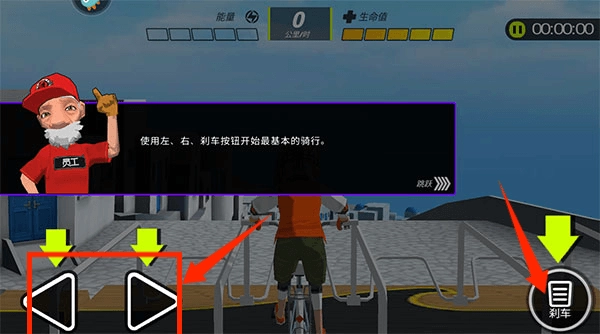 左下方按钮左右移动自行车,右下方按钮刹车。