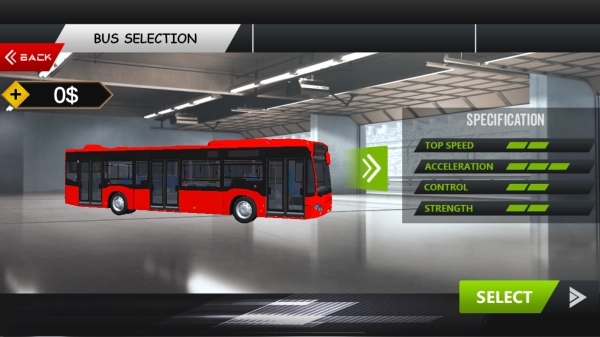 前往【BUSSELECTION】界面,查看红色巴士的参数(TOPSPEED),点击【SELECT】按钮选中该巴士,为任务做准备。