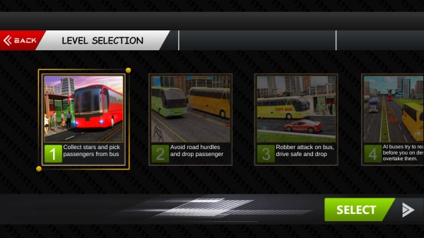 进入【关卡选择】界面,选择关卡1(Collectstarsan),点击【确认选择】按钮,随后按照任务要求驾驶巴士接送乘客。