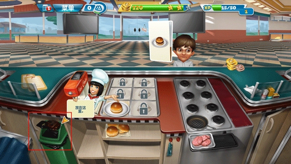 3、要是你做的牛排烤焦了,点击这块牛排把它移到垃圾桶就行。你得完成关卡开始时给出的目标指数,这样才算达成今日的业绩要求。