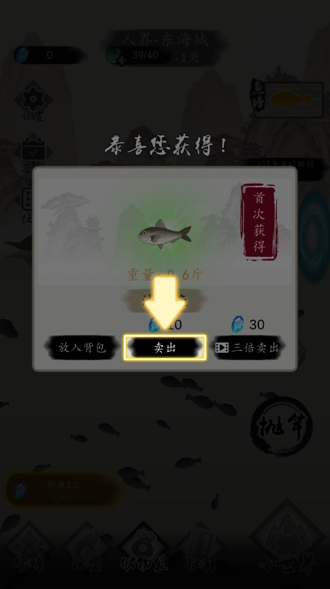 4、成功钓上鱼之后,就点击卖出即可获得砖石。