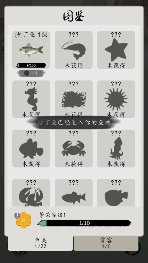 6、你还可以进入图鉴,获取各个种类的鱼,把它们收入你的鱼塘,提高繁荣等级可以得到更多的鱼类。