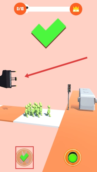 在关卡里,跟着箭头的指示,借助左下角的剪刀工具或者右下角的绿灯,引导人群平安通过马路,达成目标。