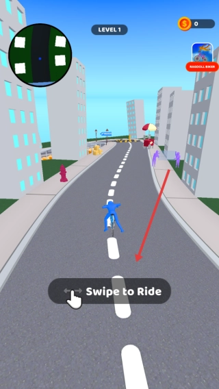 进入LEVEL1关卡后,找到【Swipe to Ride】的提示,按照提示滑动屏幕,就能让蓝色小人开始骑车啦。