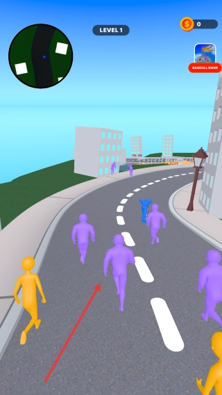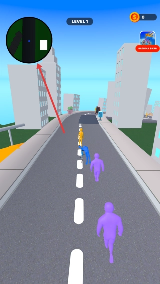 请留意左上角的小地图,按照指示的路线行驶,超越黄色和紫色的行人角色,过程中注意避免发生碰撞。