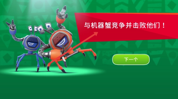 按照引导操作,点击【下一个】按钮,即可了解具体玩法:你将与机器蟹(Crabots)展开竞争,通过操控角色战胜对手,从而推动流程向前进行。