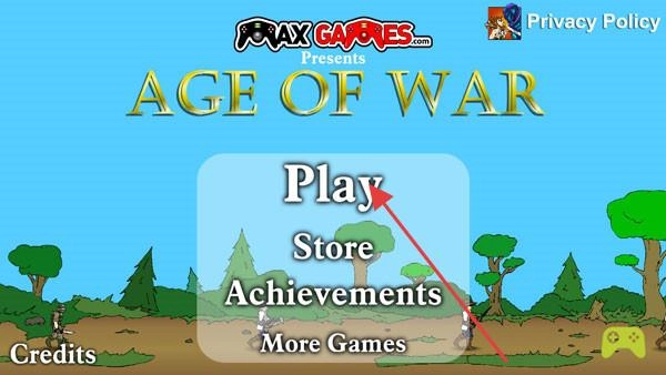 游戏启动界面上,呈现着“Age of War”的字样,还设有“Play”(开始游戏)、“Store”(商店)等功能选项,该界面由“MAX GAMES”提供。