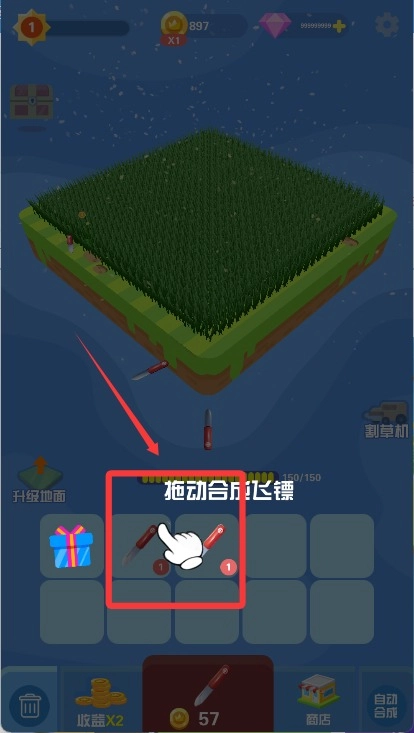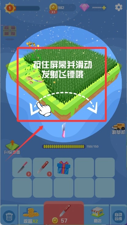 按住屏幕并滑动就可以发射飞镖割草了。