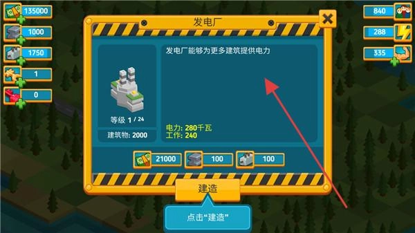 在发电厂的操作界面中,投入相应资源后点击“建造”按钮,可使电力提升280千瓦,从而为更多建筑提供电力支持,确保城市的正常运转。