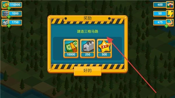 完成“建造三格马路”的任务后领取奖励,点击“好的”确认领取,这些奖励可用于升级建筑和解锁新区域。