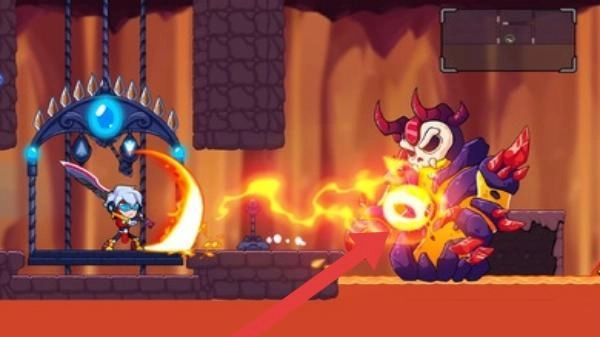 这是一款横版动作格斗游戏,游戏内包含角色和恶魔型BOSS(画面右侧的巨大怪物)等实体元素,场景采用地牢风格设计,展现出激烈的战斗对决场景。玩家需要操控角色,运用技能与武器展开攻击,对抗BOSS以推进游戏关卡。